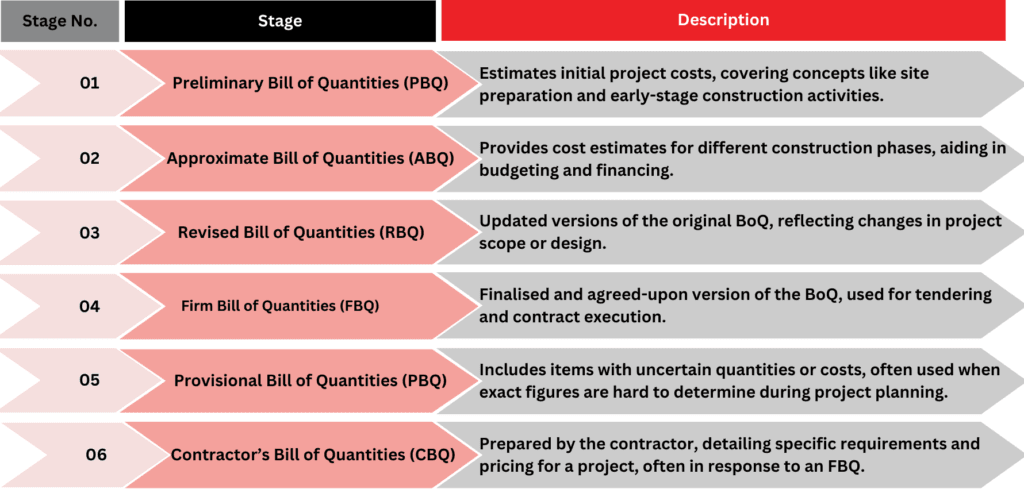 Various stages of Bill Of Quantities: