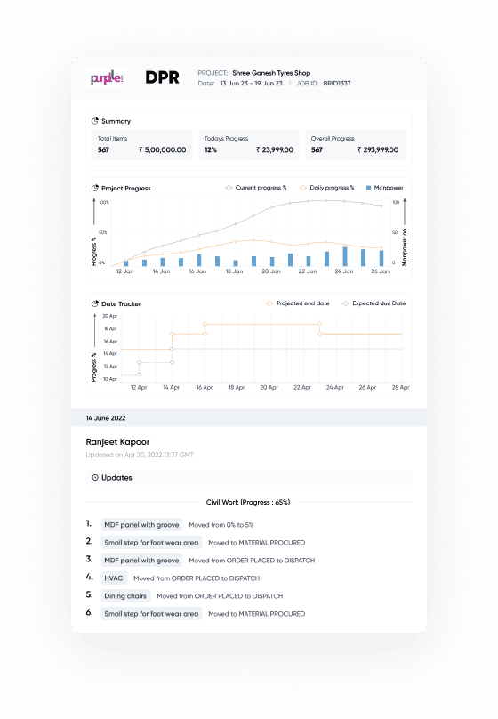 Everything around your projects, drawings, progress and timelines and manpower is available in realtime, at one place, whenever.