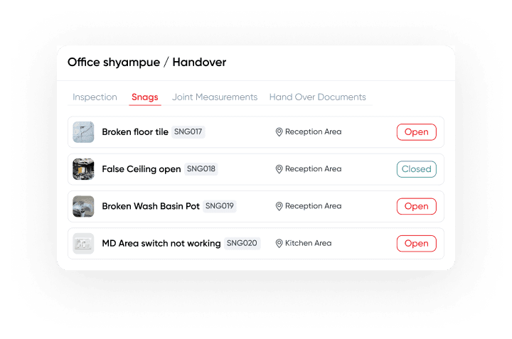 Detail site recce, Standard Specs guidelines, Audit & snaglist management enables you to control quality of materials and services at every step.