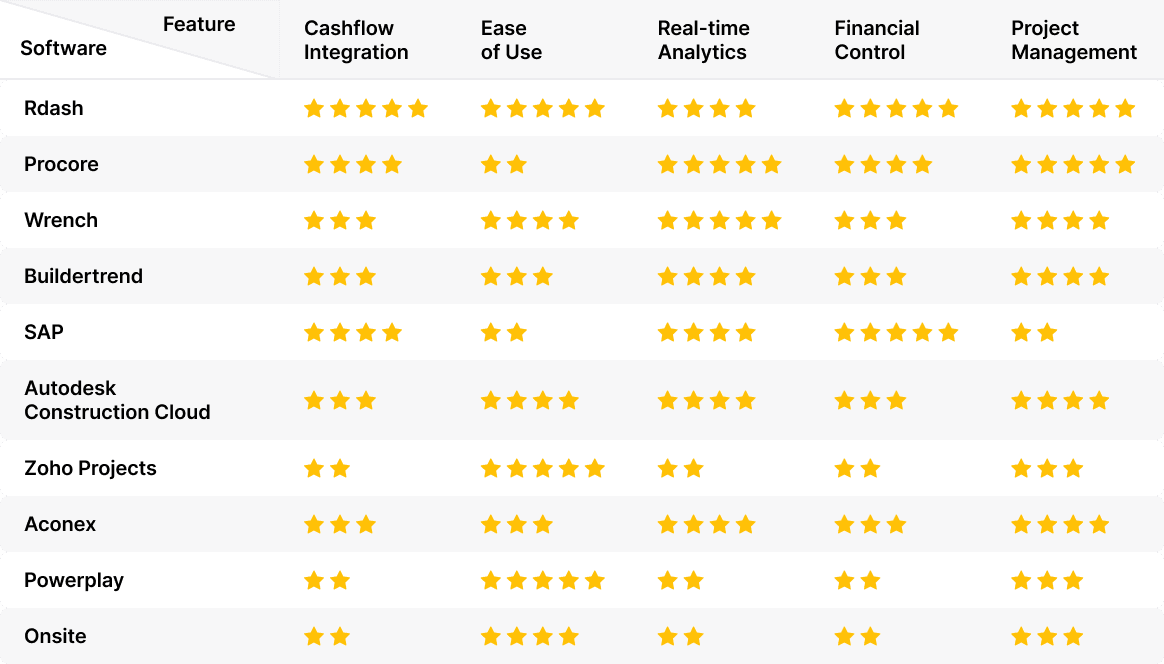 Robust and collaborative, excels in managing complex projects across multiple locations. Strong analytics and reporting, but slightly less emphasis on financial cashflow integration compared to Rdash.