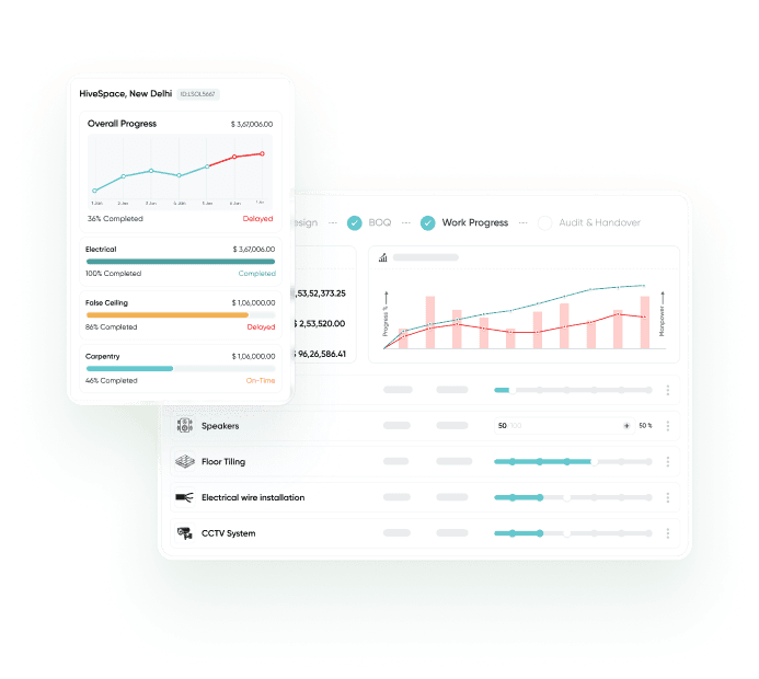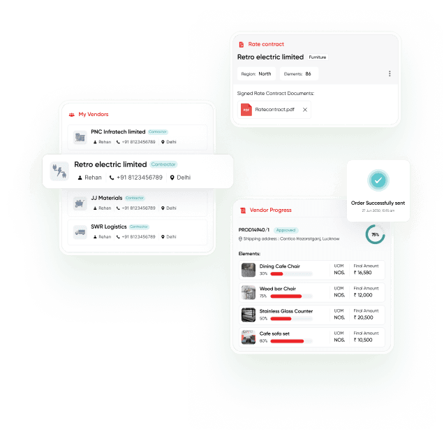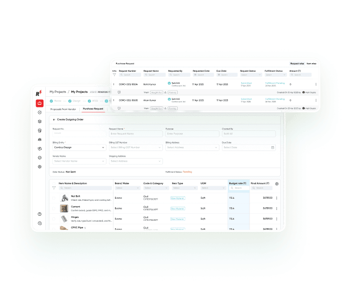 Automate procurement and finance workflows with rate contracts, vendor orders, material control, and real-time cashflow visibility across sites and projects.