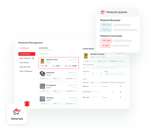 Track site store inventory, track material GRN (Good Receipt Note) and consumption, transfer materials from one site to another, and issue material to suppliers