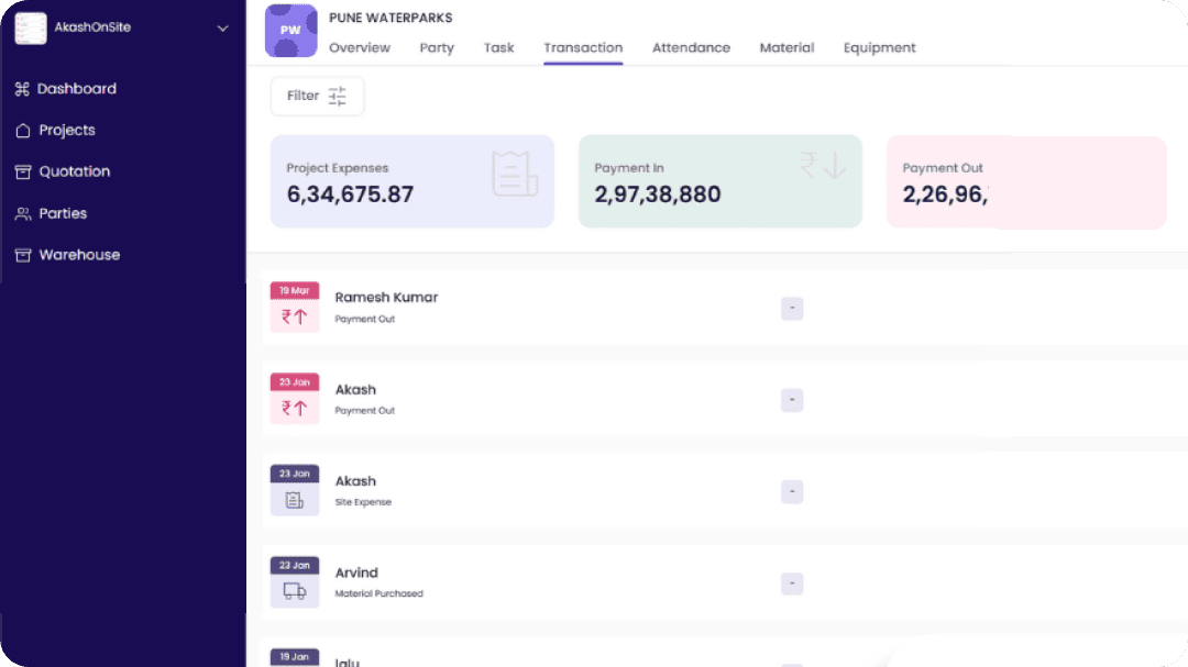 Onsite is a lightweight project tracking software where you can track site progress and manpower attendance. It also has basic task and ticketing functionality, placeholders to digitally organise design files, and workflows to generate POs. It is a good tool to start your digitisation journey. However, Onsite can be a limiting factor when you scale and looking to mature your processes to advance change orders management, automate client reporting, track item level P&L, bring robustness in procurement with approval hierarchies, implement specific quality management modules, or generate advance analytics around your construction work.